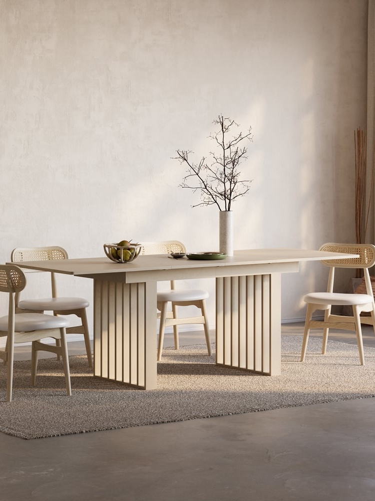 Add style and elegance to your dining room with this beautiful Japandi-style extendable dining table, made with oak veneer and a whitewash finish that exudes serenity and modernity. This table will extend from 1400mm to 2200mm, sitting four to eight guests in total comfort, hence ideal for intimate dinners up to larger gatherings. The double pedestal base assures stability and allows ample legroom for comfortable dining. Ideal for a modern, minimalist dining room with natural touches of elegance.
