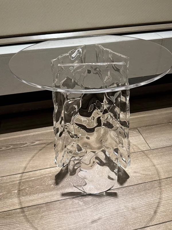 • Sculpted Acrylic Base: The table’s base is crafted with intricate, water-ripple textures that mimic the fluidity of waves or the clarity of glacial ice. When light interacts with the acrylic, it refracts beautifully, creating a dynamic play of light and shadow that adds visual depth to any room.