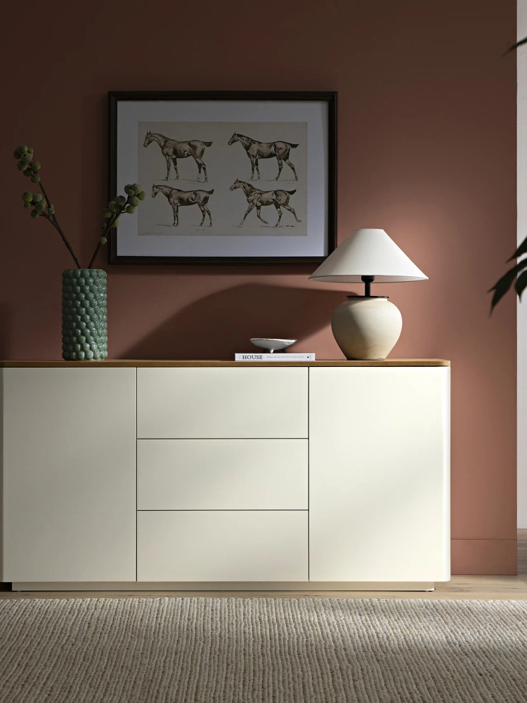 Agnes Curved Edge 2 Door 3 Drawer Wide Sideboard, Off White With Oak Top