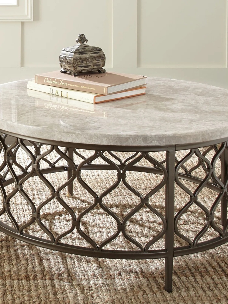 • Graceful yet grounded, this coffee table pairs a smooth beige marble top with an airy bronze hourglass base for a look that’s both refined and sculptural. The bronze powder-coated iron frame features delicate fretwork that adds visual interest without overwhelming your space. A glossy finish enhances the natural beauty of the marble, while the round shape softens its presence. Substantial in size but light in feel, it’s a striking centerpiece that brings balance and elegance to any room.