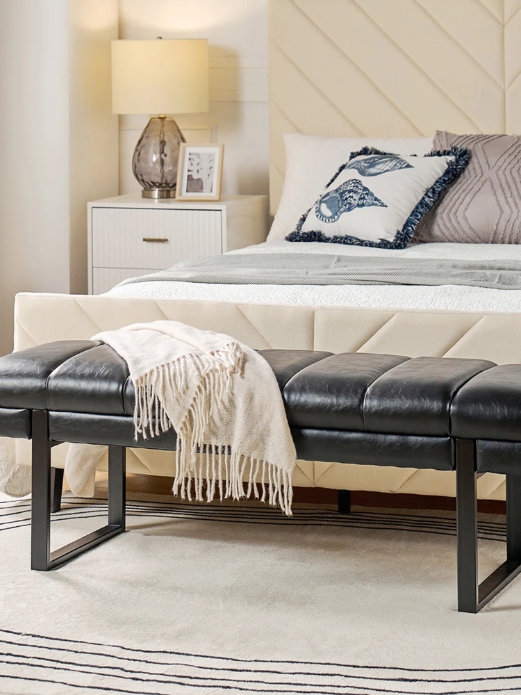 This 52" bedroom bench is your new go-to for modern flair and function. Its sleek sled metal legs and faux leather tufted upholstery make it a standout piece just right for pausing to put on your shoes in the morning. Designed with kiln-dried engineered wood, it’s a great fit for two. Plus, it fits just right at the foot of your bed or as a stylish entryway seat. Just spot clean any accidental spills to keep it looking fresh.