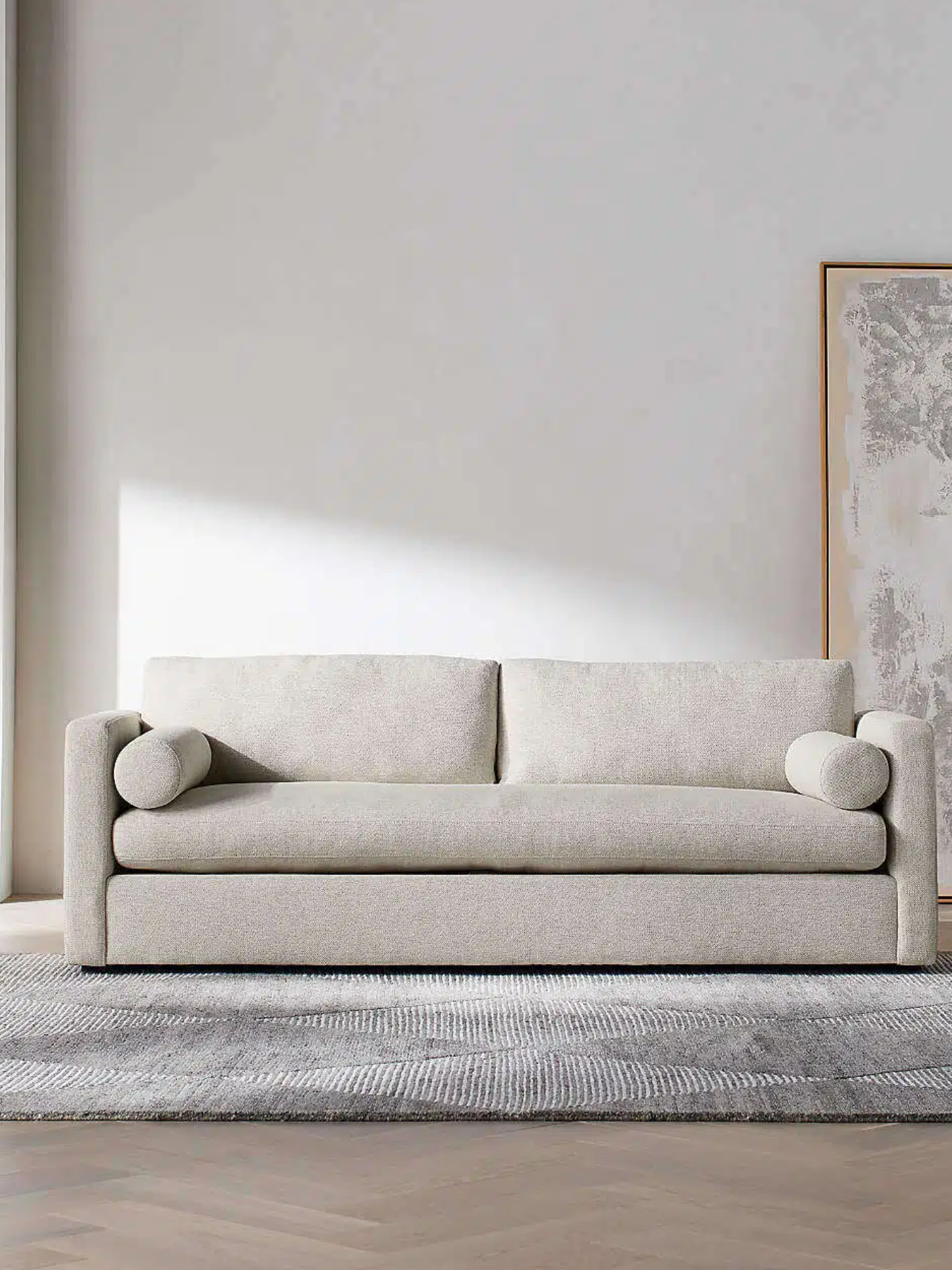 Destined to be everyone's favorite spot to chill, Aris makes modern design soft and cozy. Neat track arms and a broad deck establish the sofa's clean lines, while the plush bench seat and back cushions invite the gang to get comfortable. A couple of bolster pillows aid in getting the snuggle just right. The Aris sofa is a Crate & Barrel exclusive.