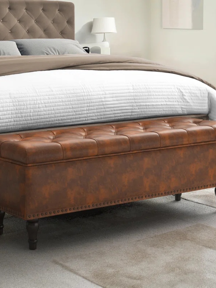 This upholstered storage bench adds a touch of sophistication and practicality to your home. With its linen fabric covering, foam padding, and elegant solid wood legs, it's a comfortable and stylish seating option for your living room, entryway, or bedroom. The deep button tufting and nail-head detailing elevate the bench's appearance, while the flip-top design reveals a spacious storage compartment, perfect for discreetly stowing away blankets, books, and toys. This versatile bench not only offers additional seating but also helps keep your space organized and clutter-free. Weight capacity of 330 lbs.