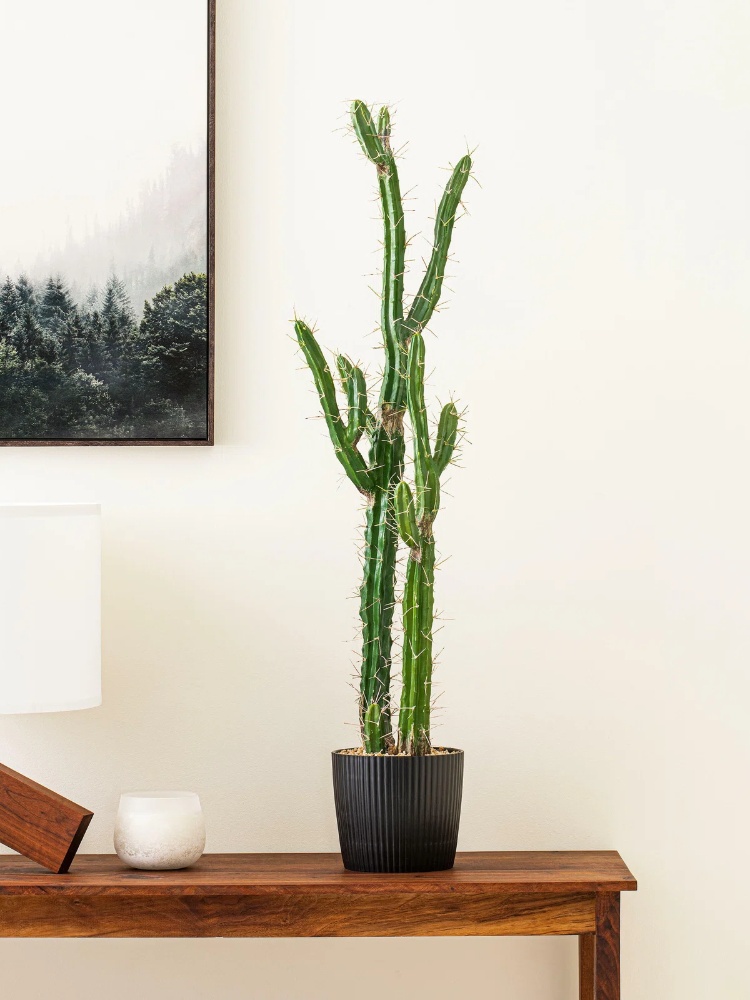 Offering all of the greenery with none of the upkeep, this artificial cactus brings an eclectic feel to your office or living room. It's made from plastic and crafted to mimic the look of a real cactus, with slim green columns decorated with sharp spikes. It rests in a classic black pot made of plastic with a sturdy base, making it easy to add a touch of boho flair to your desk or bookshelf. Since this plant doesn't require watering, it stays looking fresh and vibrant from season to season. Just give it a dusting every now and then.