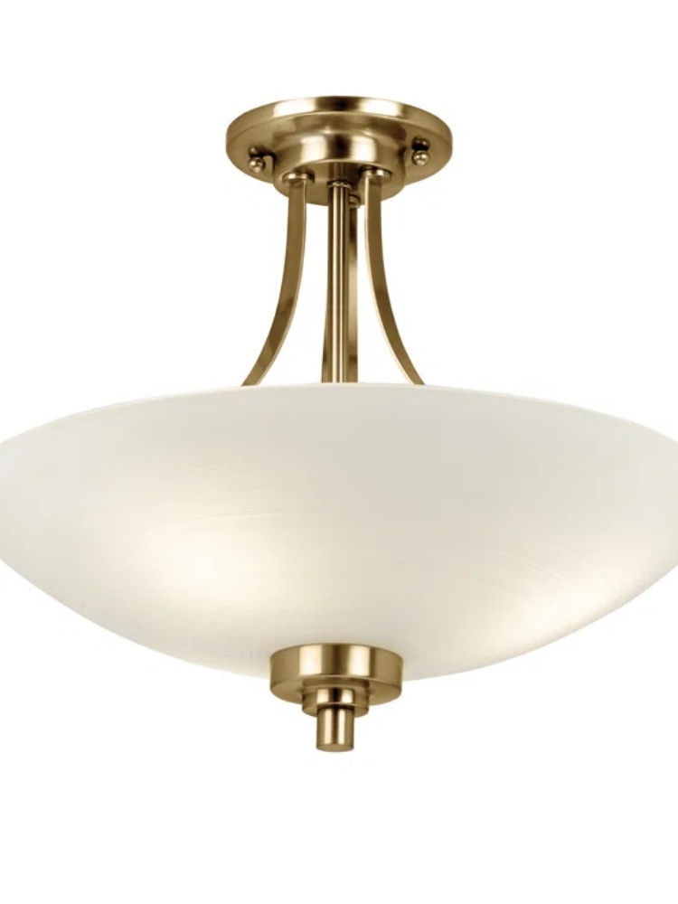 • Brimming with charm, this three-light semi-flush mount features a frosted glass shade and elegant swooping metalwork in your choice of vintage-inspired metallic finishes. It is LED-compatible and features a dimmable function to allow greater control over your lighting mood. Lightbulbs are not included.