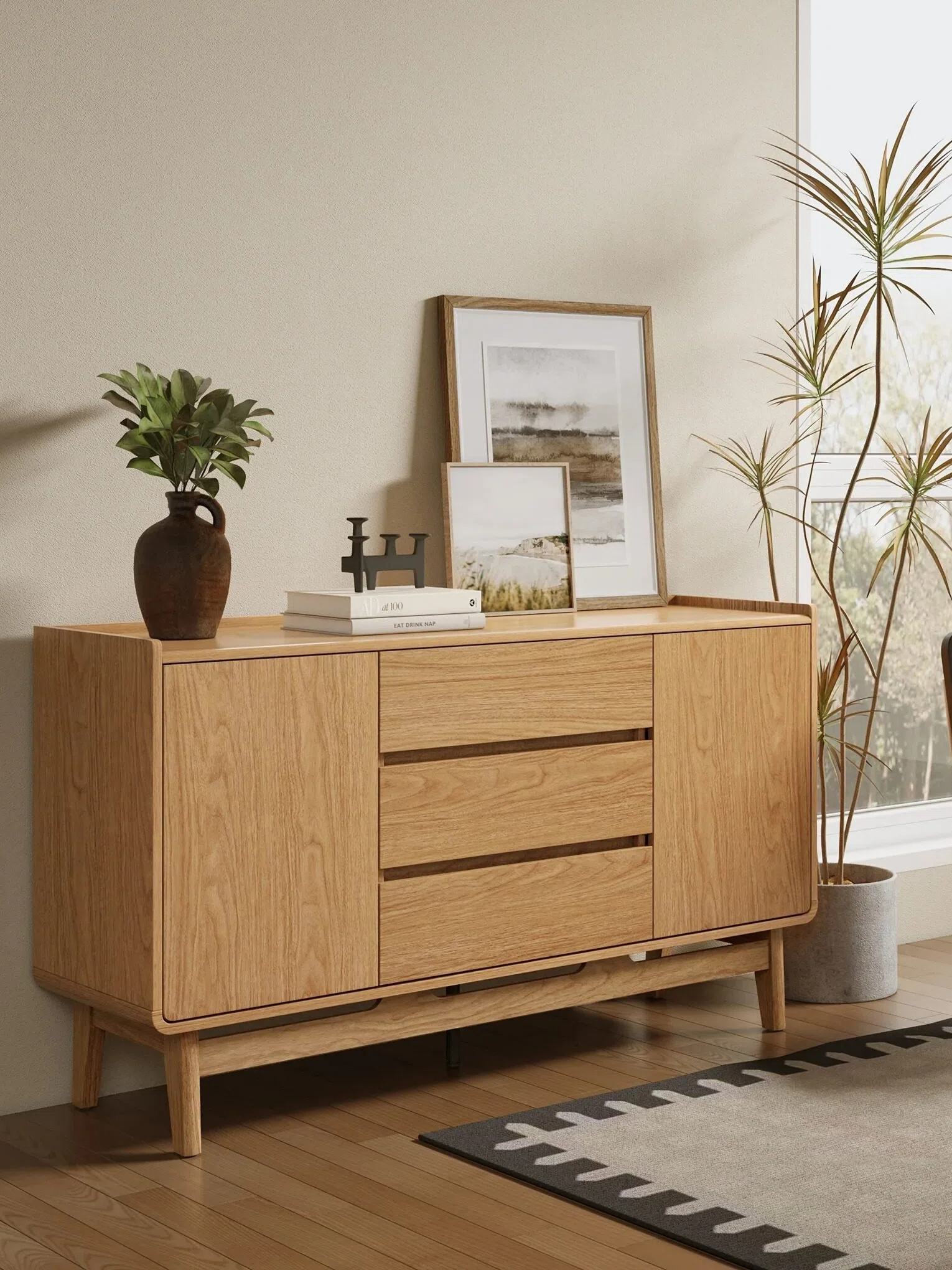Bring timeless style and practical storage to your home with this elegant Sideboard Storage Cabinet. Crafted in a warm oak finish, this piece functions beautifully as an oak finish sideboard, adding natural warmth and texture to your space. Its clean lines and sleek silhouette reflect the essence of a mid century modern sideboard, perfect for enhancing both dining and living rooms. With three spacious drawers and ample shelving behind cabinet doors, this Scandinavian Design sideboard offers a versatile solution for organizing dinnerware, linens, or décor. The combination of style and function makes this cabinet an ideal choice for modern homes seeking minimalist design and efficient storage. Elevate your interior with this stylish sideboard that seamlessly blends contemporary aesthetics with practical organization.