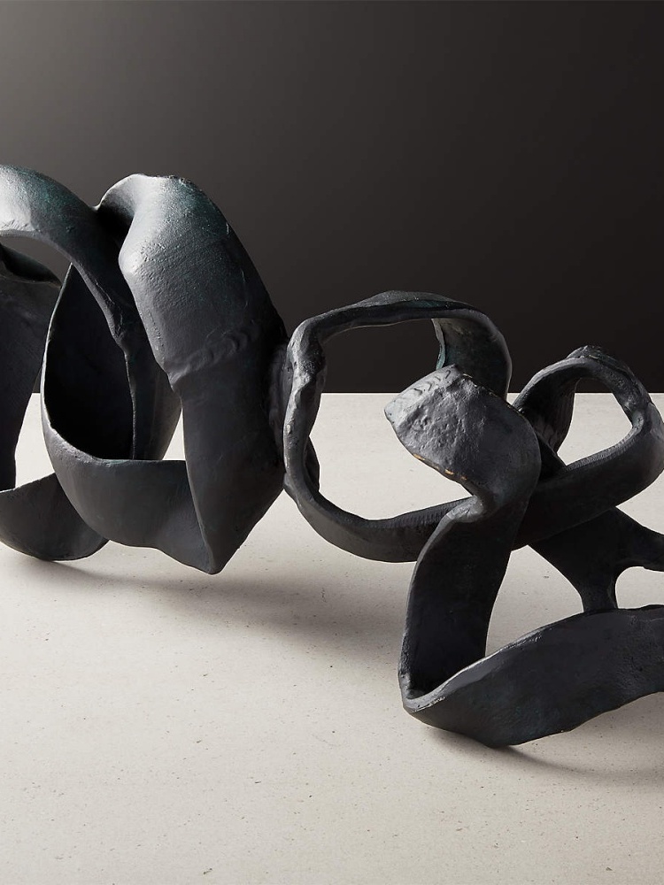 Handmade copper-plated aluminum takes shape in a decorative object fit for long dining tables and dramatic mantles. Sculpture is finished in a black wash and gives off slight hints of green patina at just the right angle. CB2 exclusive.