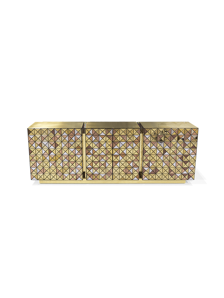 Double-sided sideboard with three doors covered by triangles made from anodized aluminum. Different tones of stainless steel in gold, copper and silver; with brushed and polished finishes.