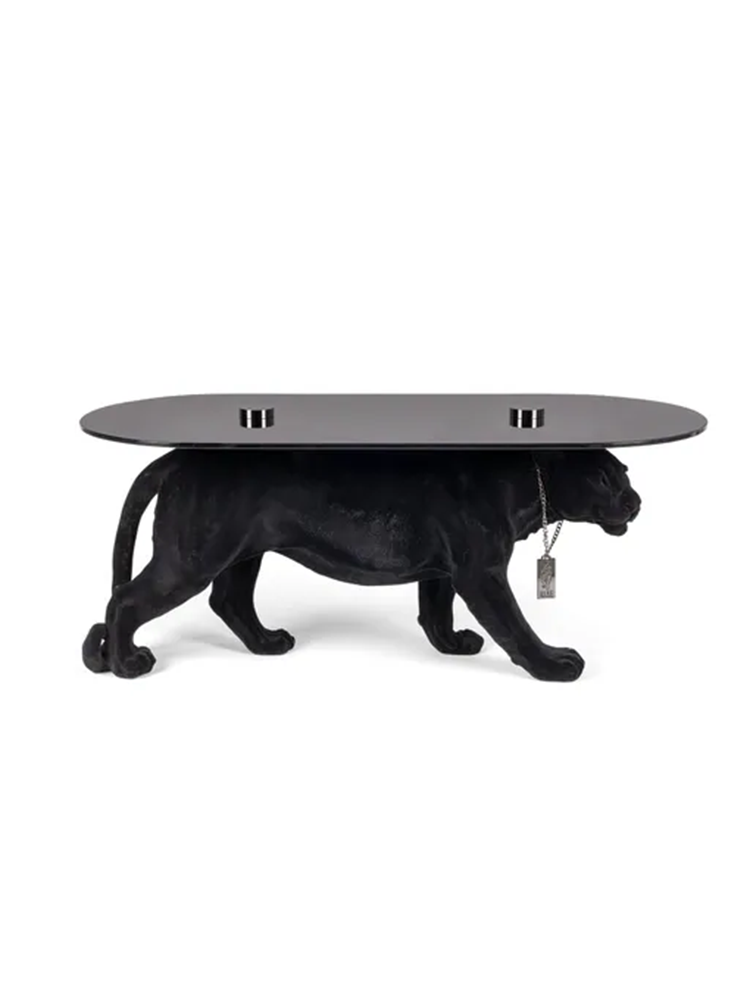 • You either love it or hate it; there’s no middle ground with this daring hand-painted Bold Monkey Dope As Hell panther coffee table. The retro '90s vibe oozes from the panther's black-colored chain featuring our striking logo.
