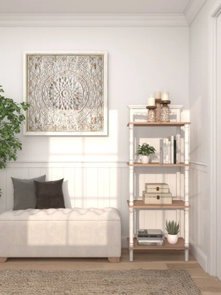 We've taken the simplistic design of a shelf and updated it with farmhouse style in this 4-shelf storage unit. Crafted from solid wood, it features a French country-inspired construction with four open shelves balanced on turned and molded supports. Bun feet and a decorative, scrolling carved design on top create an antique-like look, while a distressed whitewash finish gives it a well-worn effect that we love. Organize your books, linens, or toiletries with this piece. At just 22'' wide, it's a great fit in any corner.