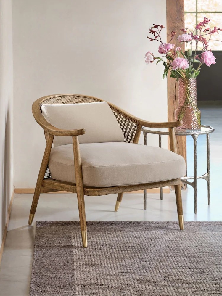 • his Reuben Accent chair is a lovely mix of modern and rustic, offering a style that will stand the test of time through differing tastes and trends. The backrest is curved with modern rattan detail and the metal caps offer a touch of luxury.