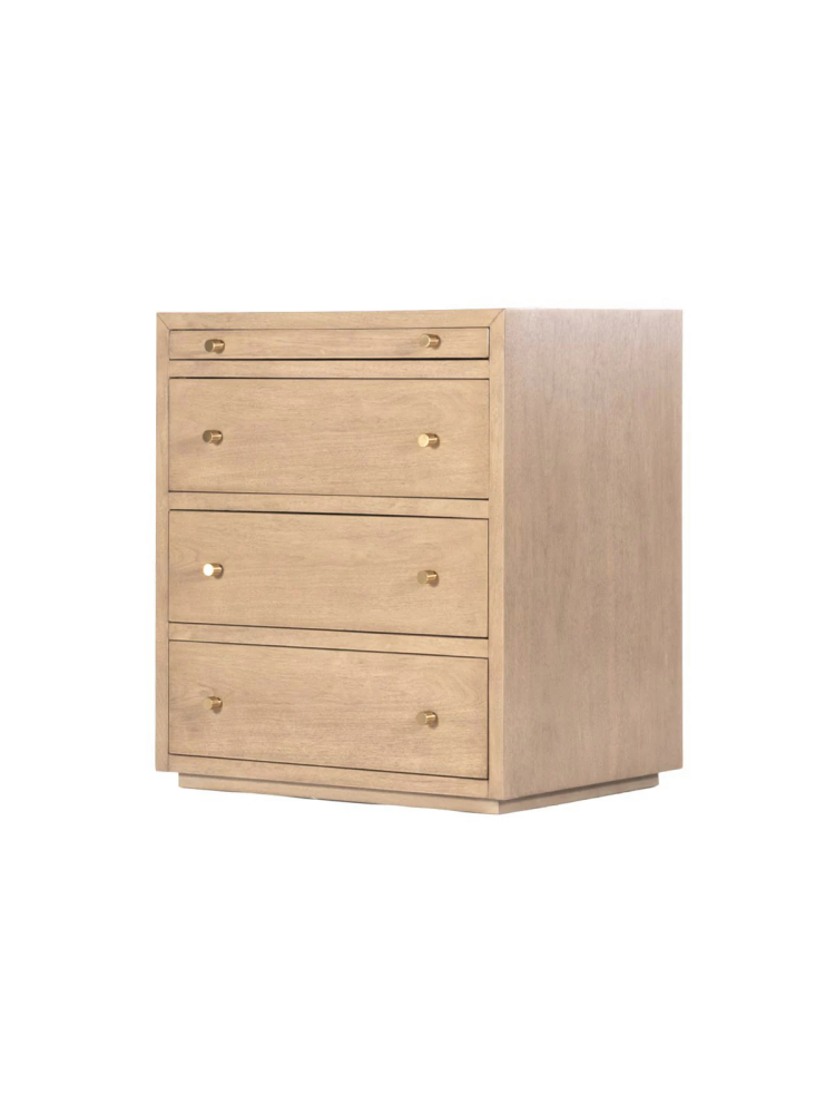 • The Brooklyn Nightstand showcases simple elegance with its square form complemented by three ample drawers. One slim accessory drawer lined in high-pile velvet, protects jewelry and electronics when stored. Small, textured brass knobs further elevate Brooklyn's tasteful design, blending functionality with style. Its natural, bleached Walnut wood displays beautifully in pairs around the bed, lending a refined touch.