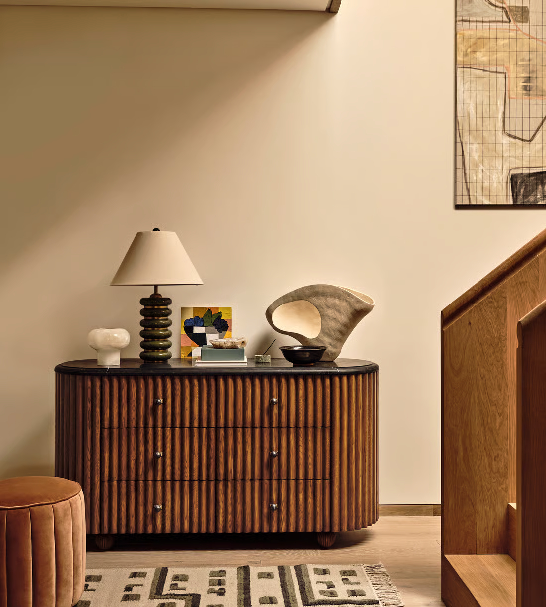 Taking design cues from the channelled wood bars at White City House, the Carlise dresser is crafted from solid, laminated oak with a fluted finish. Softened by rounded corners, its silhouette is set on bun feet and fitted with six spacious drawers for storage.