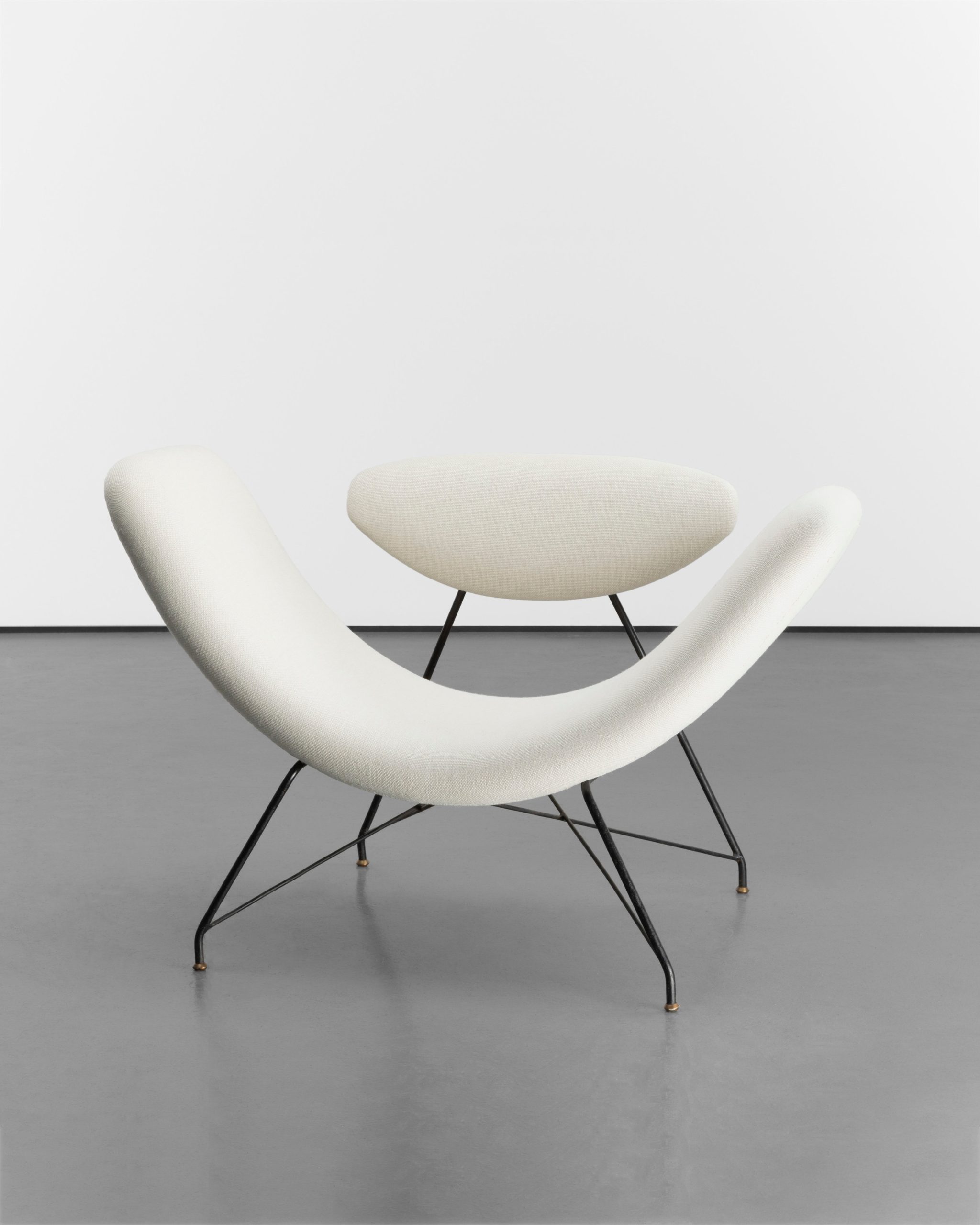 Carlo Hauner and Martin Eisler founded the influential Brazilian design studio Forma in the 1950s. Hauner and Eisler were among many European designers who moved to South America during this time when fresh materials and new processes were being introduced into the commercial market. This reversible armchair demonstrates the central tenets of their modernist design philosophy, characterized by thin tubular frames juxtaposed against a clean upholstered finish. The matching curves of the two components combine the minimalism of European modernism with the sensual forms of Brazilian design. The clever design allows the chair to be repositioned freely. Today this piece is among the most recognizable designs by Hauner and Eisler and a symbol of mid-century modernism.