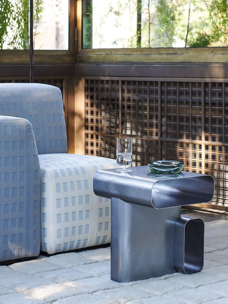 Made of stainless steel, it is composed of three pieces, assembled through an intricate, very precise process that hides the connections from view. It echoes the same curved design of the ottomans but with a captivating interplay of positive and negative spaces. The open, functional lines of this piece can be adapted to different interpretations of use ‒ in addition to providing a table-top surface, magazines or objects can be placed inside it. In an eloquent juxtaposition of warm and cold materials, the coffee table coordinates with the upholstered pieces in terms of functionality and style and is designed to overlap one of the three ottomans.
