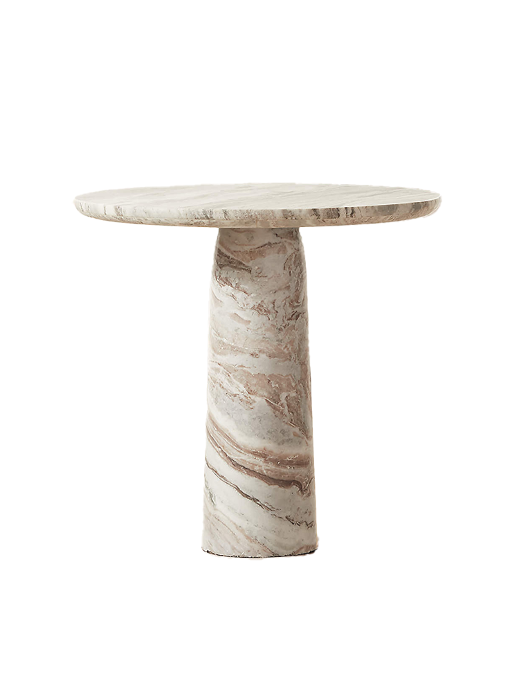 • Honed Torrento marble bistro table by Barcelona-based Mermelada Estudio is a sculptural work of art. The gracefully tapered pedestal and smooth, rounded top looks clean, drawing attention to the marble's bold white and light grey veining. Organic variations in the marble make each table unique.