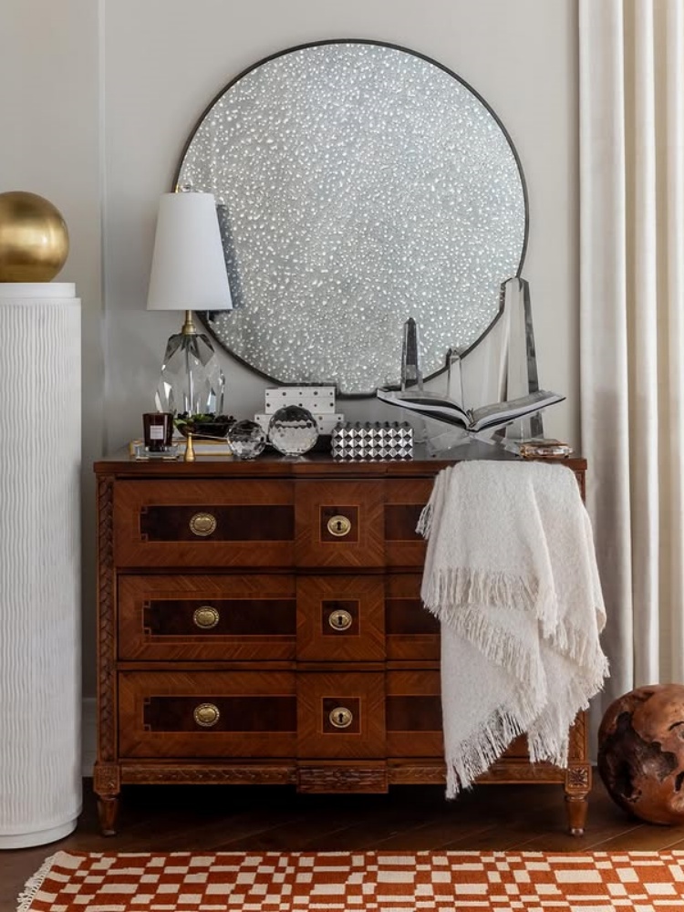 • This handsome chest lends a rich depth to living rooms, entryways, and hallways. Crafted from walnut, cherry, and maple wood veneers, its natural tones and graining are a luxurious addition. Brass hardware and soft-close drawers further elevate its functional, tasteful design, creating a timeless addition to any space.