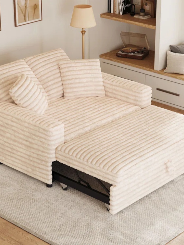 Perfect for compact living spaces, this soft chenille sleeper sofa offers the ideal mix of comfort and function. Upholstered in plush, warm fabric that’s especially cozy on colder days, it seats two and easily converts into a single sleeper with a bed module — great for guests or relaxing nights in. Built on a solid wood frame with supportive spring construction, it includes two large back cushions and two bolster pillows. Truly a versatile design.