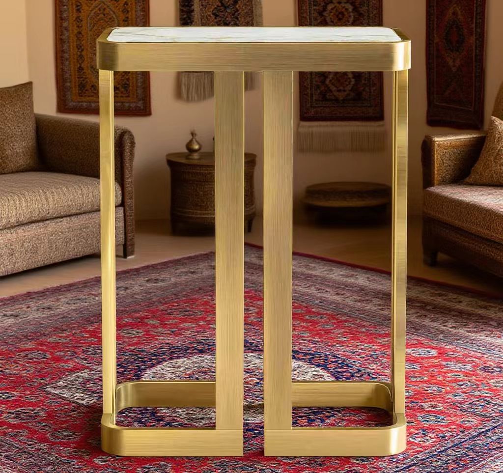 • The supporting structure of this magnifiscent piece, is crafted entirely in brass and forms a striking geometric pattern. Its top features one long slab of marble, which is imbedded into the brass structure making for an elegant and clean look. This side table is ideal when placed in a modern environment but can instantly enhance the look of any decor. Alternate material combinations are available for the structure and top.
