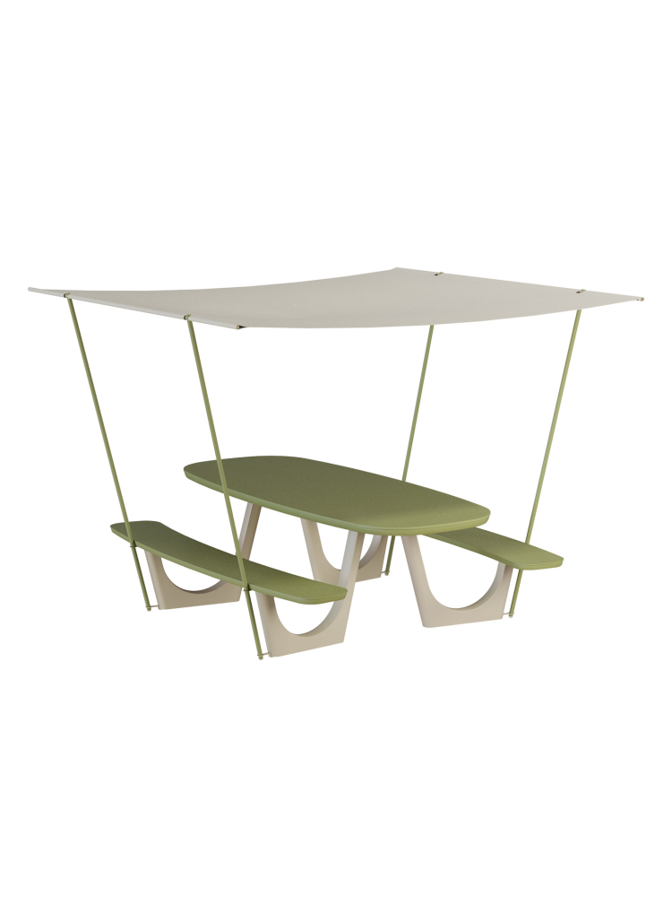 • Clogs series is intended to show the combination and application of diverse materials and functional forms in outdoor furniture. Clogs Canopy Dining Set features a signature curved base, designed for easy seating and movement. Its widened bench and cushions on each side accommodate 8–10 people, ensuring comfort and social interaction. The quick-release canopy system uses four stainless steel poles that connect to the tabletop with circular plug-ins. It provides reliable sun and rain protection while making setup and removal easy. It enhances the visual diversity of urban and private spaces while offering a fresh solution for modern outdoor living.