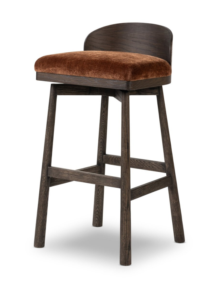 • Channel vintage vibes with a swivel stool perfectly sized for the bar. Crafted of dark-finished oak, a low, molded back adds a playful touch, while an upholstered seat offers comfort and color. Finished off with a memory swivel to ensure the stool's curved wood back stays perfectly aligned.
