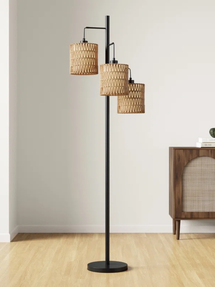 Illuminate your living room or bedroom with this beachy 3-light floor lamp. It features a slender wrought iron frame that consists of a circular base and a sleek pole that rises up to three separate arms. At the end of each is a drum-shaped rattan shade that filters the glow from a 60W max bulb, which is sold separately and controlled by a corded foot switch. At 65" tall, this compact lamp is a great option for space-conscious rooms,