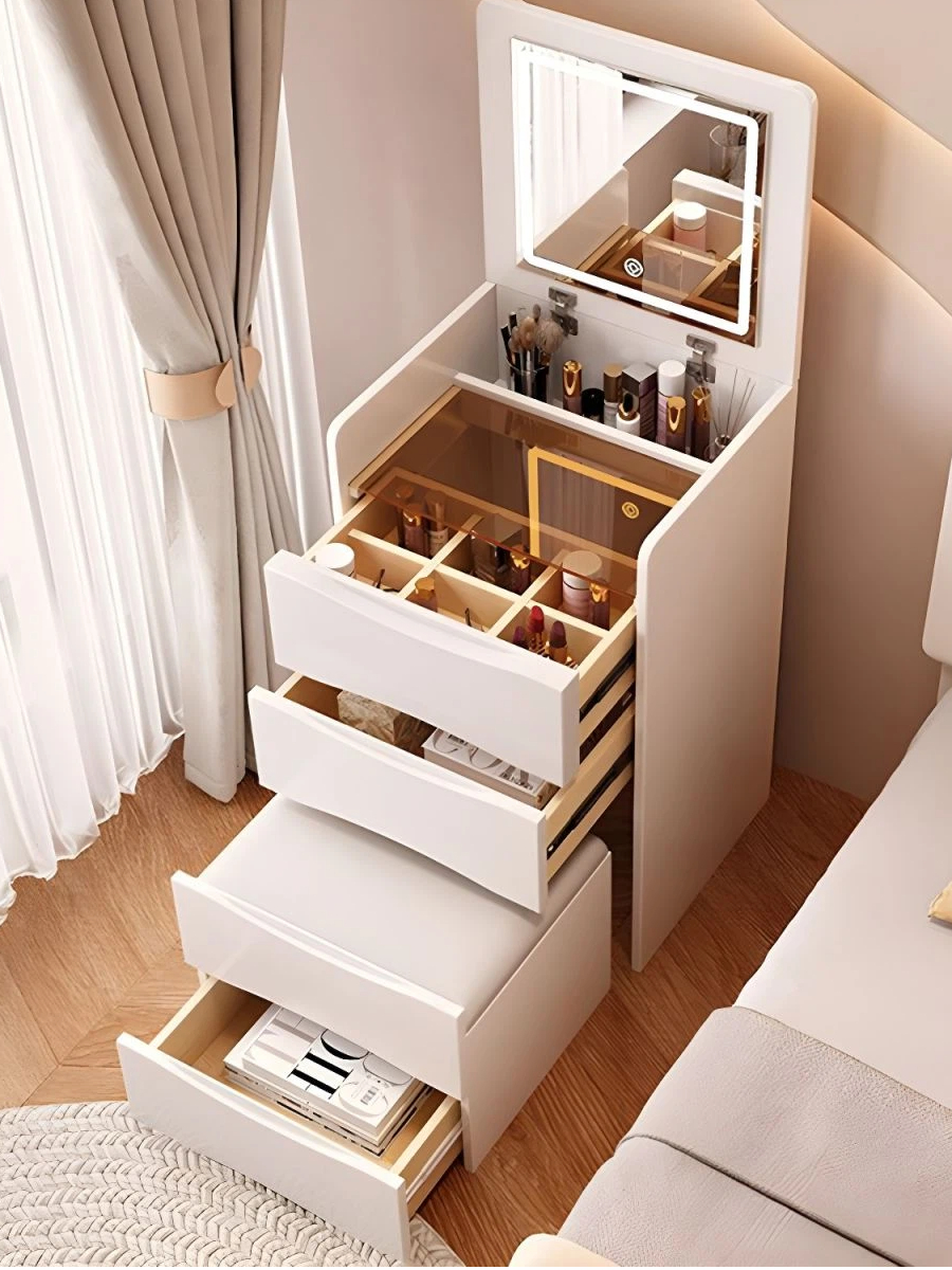• When closed, this piece functions as a sleek, tall storage cabinet that blends seamlessly into modern bedrooms. Open the top section, and it reveals a hidden LED-lit mirror and an organized makeup station—turning “storage” into a fully-equipped vanity in seconds.