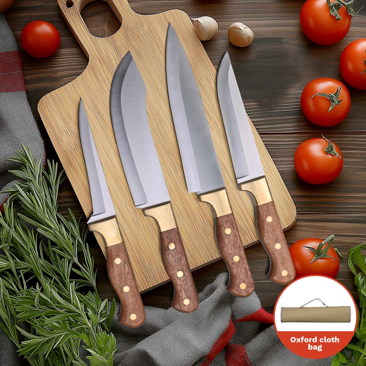 Copper-Head Knife Set: Outdoor Kitchen Knife Set Of Four With Oxford Fabric Storage Bag And Original Wood Copper-Head Handle (Deboning, Skinning, Carving, Cutting)