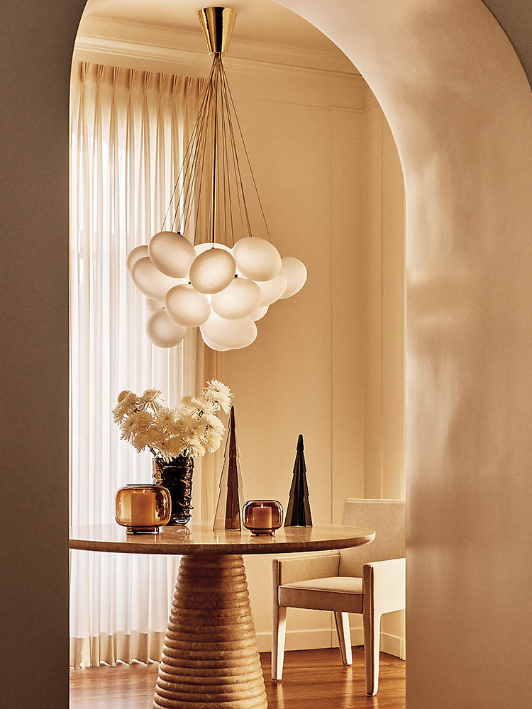 • Descending in luminous droplets, Balutto Associati's cluster of frosted glass spheres emits a soft, comforting glow. Anchored by a center pole, each of the 16 globes is suspended from unlacquered polished brass downrods that converge in an unlacquered polished brass base at the ceiling. Over time, the unlacquered brass will develop a uniquely beautiful patina. This chandelier is an unusual, enticing showstopper anywhere, but it becomes an enduring conversation piece in the dining room.