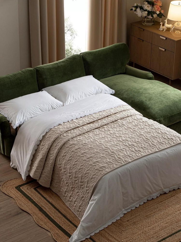 • Designed with beautiful curved back and hand tufted armrests, the sofa bed invites you to relax in comfortably and with style,