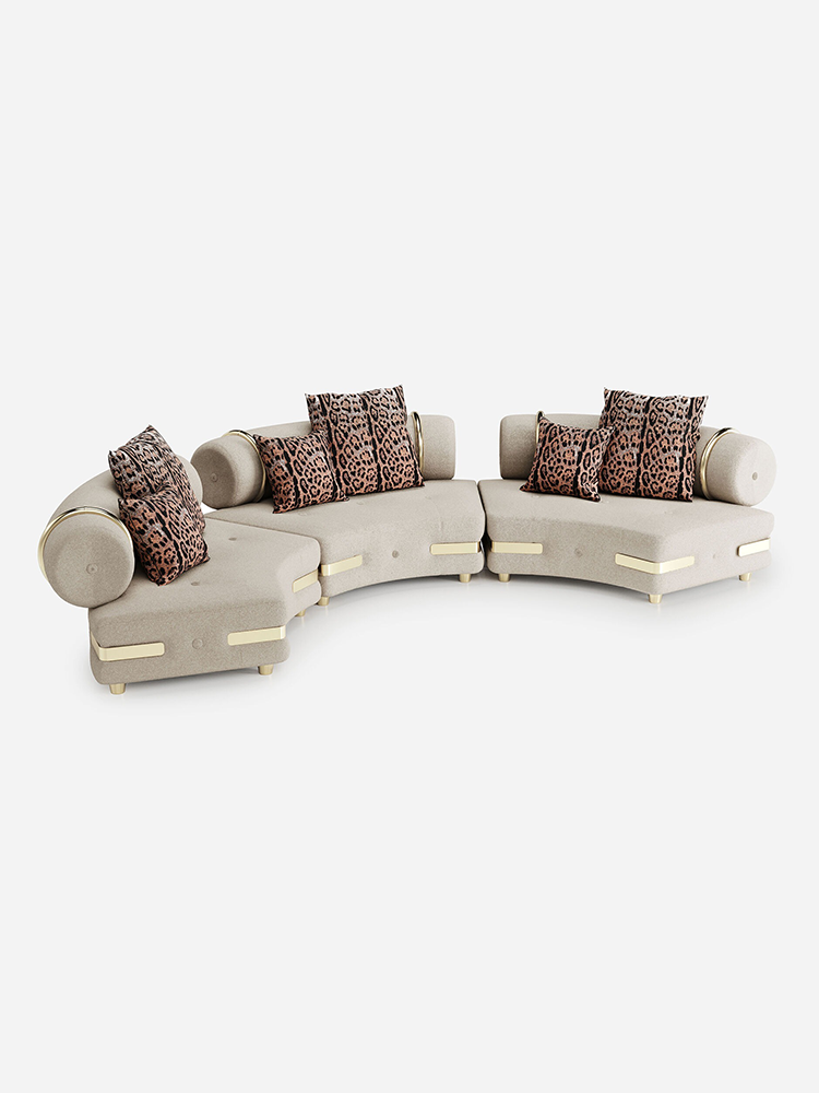 • Gardenia Lite sectional sofa by Dolce&Gabbana Casa, can host up to three people in its modular units. Illuminated with metallic detailing, the settee is equipped with cylindrical backrests and squared cushions to be arranged according to taste.