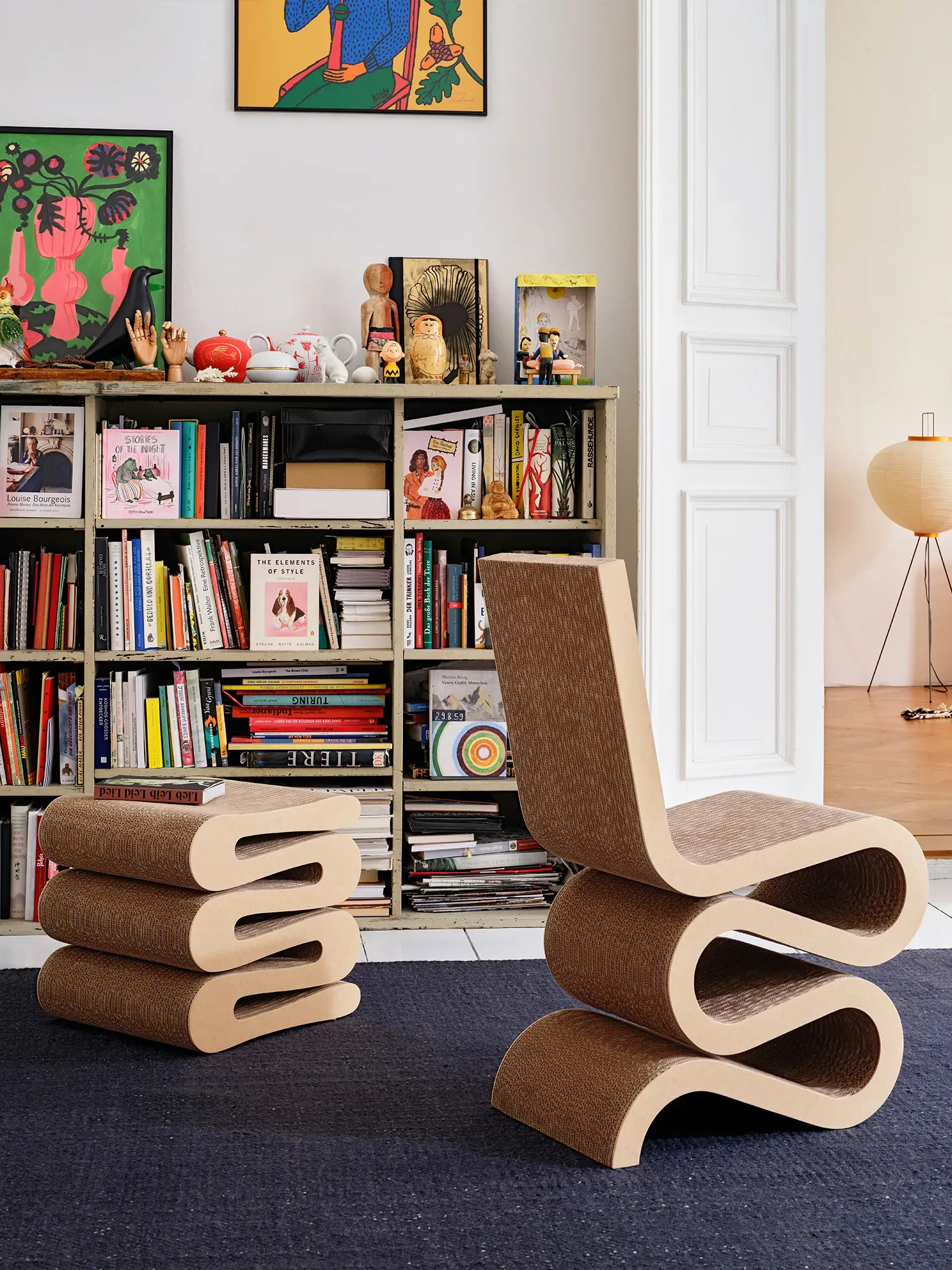 Wiggle Side Chair is a chair designed in 1972 by Frank Gehry for Vitra. Made of corrugated cardboard with natural hardboard edges. Wiggle Side Chair is part of Frank Gehry's Easy Edges collection, which also includes the Wiggle Stool. With the range, Gehry succeeded in introducing a new esthetic dimension to materials he considered mundane.