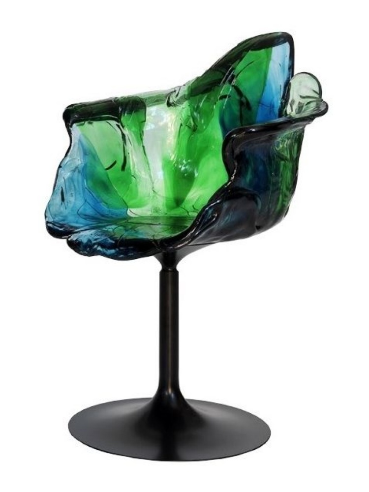 Chair with armrests, entirely handmade in polycarbonate. It is supported by a pedestal that allows rotation which stem is black and the petals of transparent and soft hues mix green and blue or gold or anthracite, recalls the shape of a flower. The elegant, comfortable seat perfectly fits in with any setting. Each piece is unique, as it is shaped by hand.