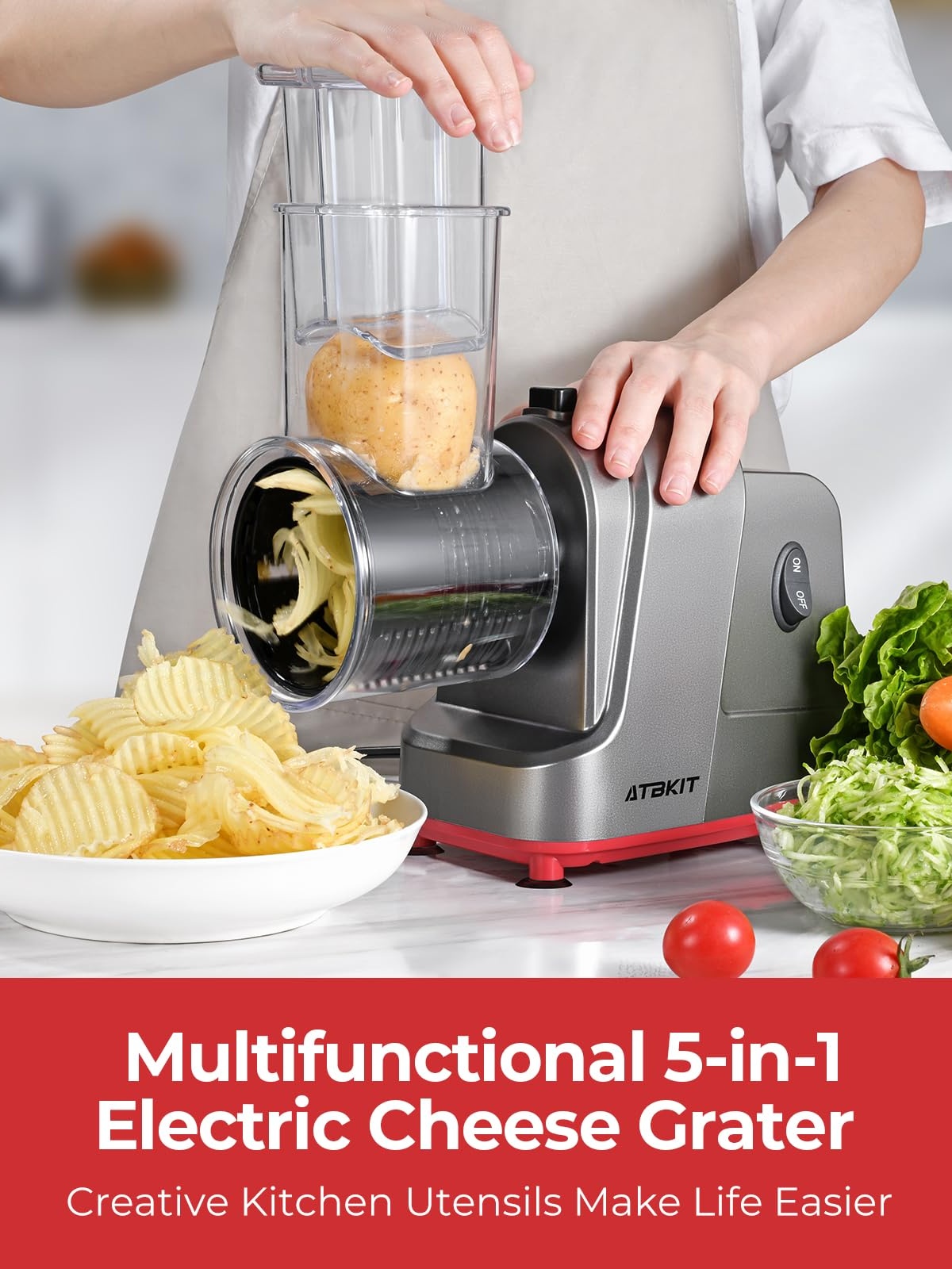 • 【5 in 1 Electric Cheese Grater】The electric cheese grater comes with 5 interchangeable stainless steel blades to satisfy your different needs. The five groups of blades are thick wire blade, thin wire blade, slice blade, wavy blade, and grinding blade.