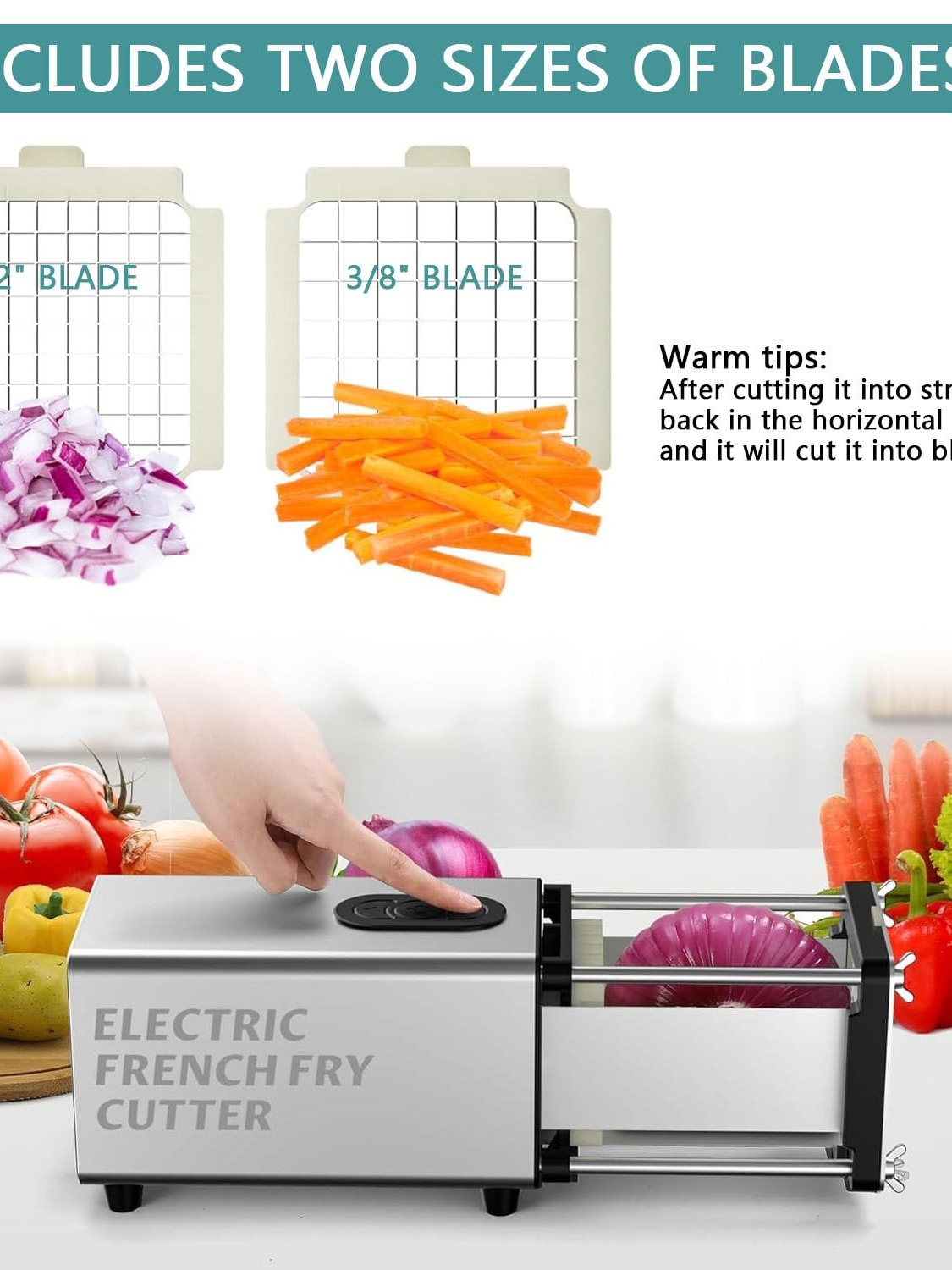 • 【ELECTRIC FRENCH FRY CUTTER】Electric french fry slicer is designed for commercial and home use. It is powered by electricity, you just plug in the power plug and it's ready to go. The electric potato slicer easy to cut food in a short time, Cuts prep time in half.