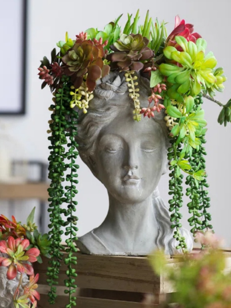 Regal elegance has never looked better with this classic bust planter, giving your space old-world charm as you house your favorite plants. Complete with a whitewash stone finish, it features exceptional detail including a floral wreath that surrounds the opening at the top. It looks amazing with trailing plants to elevate your indoor foliage, bringing a standout look to a plant stand or table top. At 15.4" tall and 10.8" wide, it takes up limited space in your home. Spot-clean with a dry cloth.