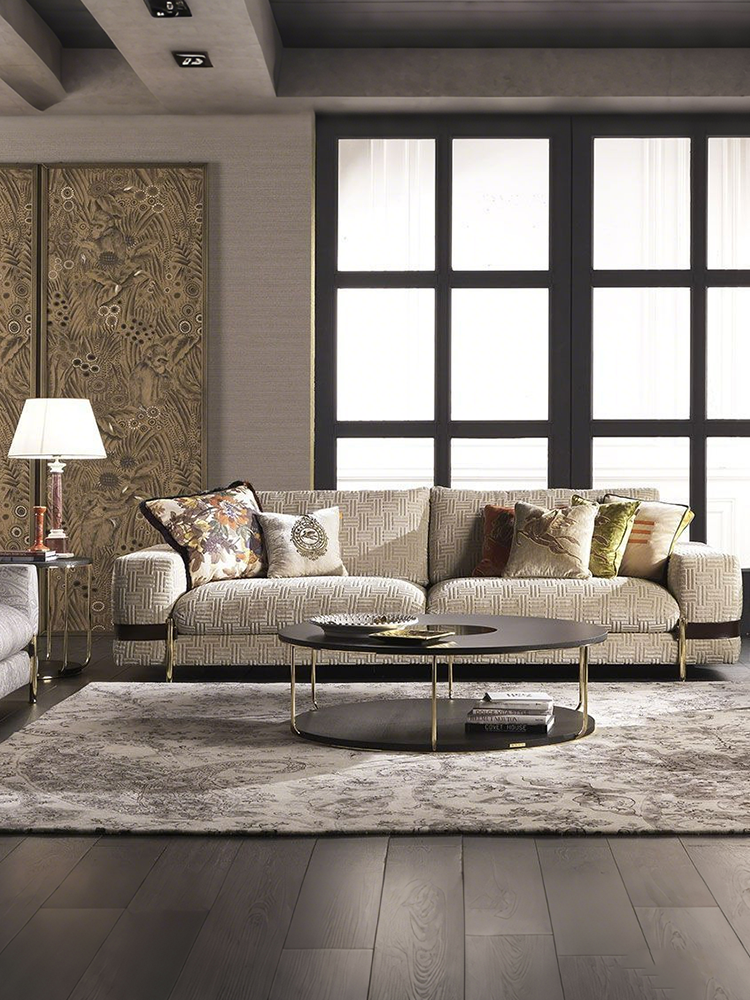 Enhanced by the leather belt, a contrasting decorative element that underlines the harmony of the shapes, the sofa expresses the brand’s most institutional character through details such as the buckle in brass with Etro logo.