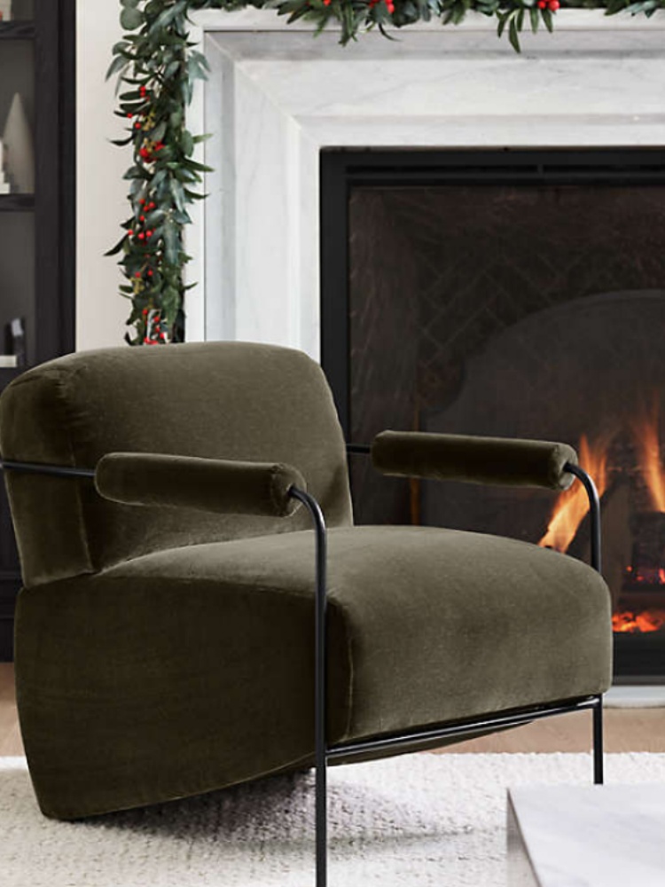 It's difficult to pick out our favorite thing about the Faroe chair—be it the sculptural design, plush comfort or attention-getting color. Based on a 1950s design, the accent chair belies its petite scale with the bold forms of its blocky back cushion, padded cylindrical armrests and a wedge-shaped seat set at a rakish angle. Slim metal rods balance the proportions, flowing in one continuous line from leg to back. Inspired by the lush greenery of the Faroe Islands, the deep green fabric is a velvet-like faux mohair with a luster that catches the light for nuanced color shifts. We love Faroe's stylized look combined with its livable proportions and medium-soft, very comfortable sit.