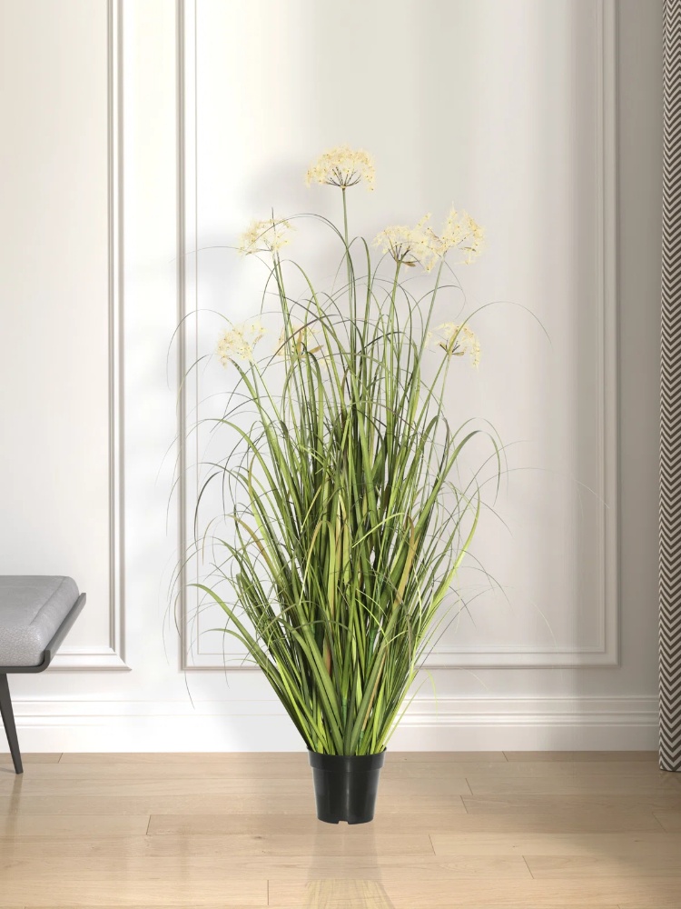 Vickerman 36" artificial potted green grass. Features 4 cream dandelions, and comes in a black plastic insertable pot, making this plant easy to place in the decorative container of your choice. Pot measures 4.5" high x 5.5" diameter.