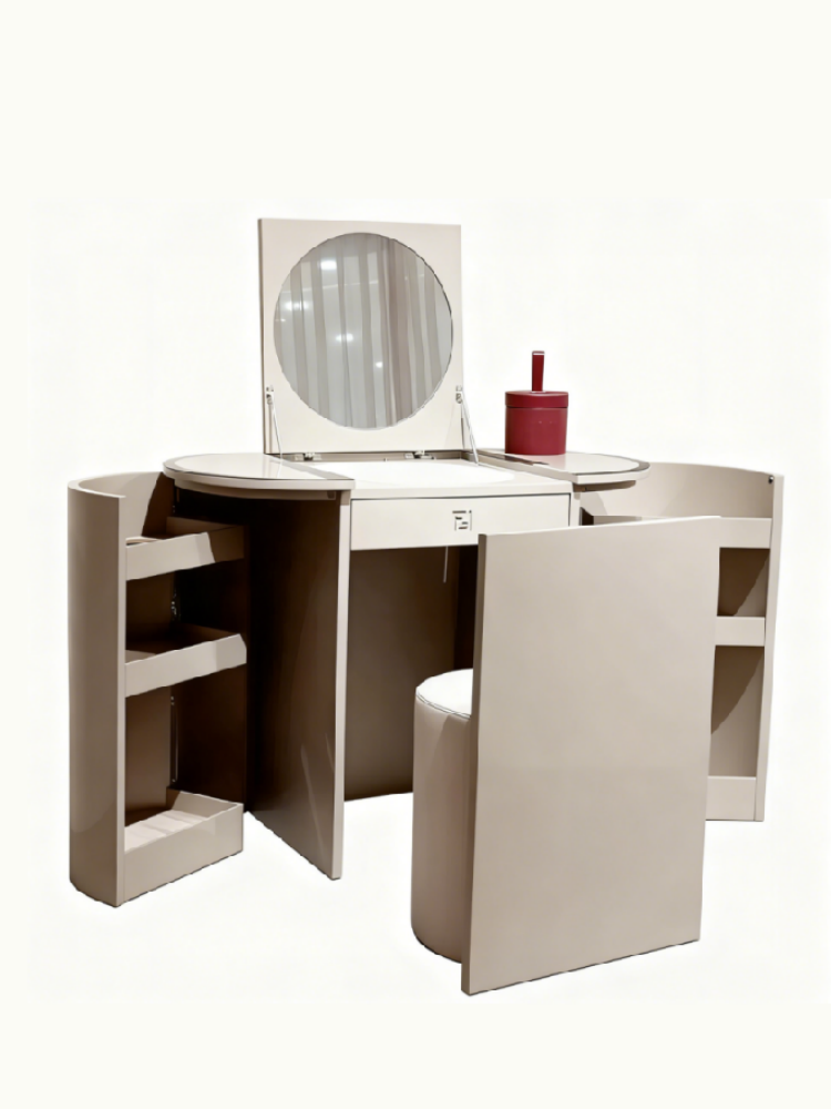 • Elegant and sophisticated, the O'Lock Vanity is a luxurious dressing table that catches the eye and elevates the style of an entire room. Its sinuous and feminine lines conceal a surprising combination of drawers, containers, and jewellery compartments. The carefully studied compact design, featuring a retractable mirror and seat, is enriched with distinctive details inspired by the Fendi O'Lock logo.