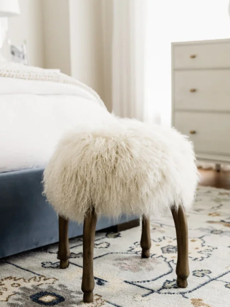 • The Fifi is the ultimate accent stool with its long, luxurious Mongolian sheepskin seat elevated by four animal hoof feet. Its playful design gives personality, effortlessly adding texture and interest to small spaces. Style in a living room, kid room, bathroom, in front of a fireplace, or under an entryway console or table.