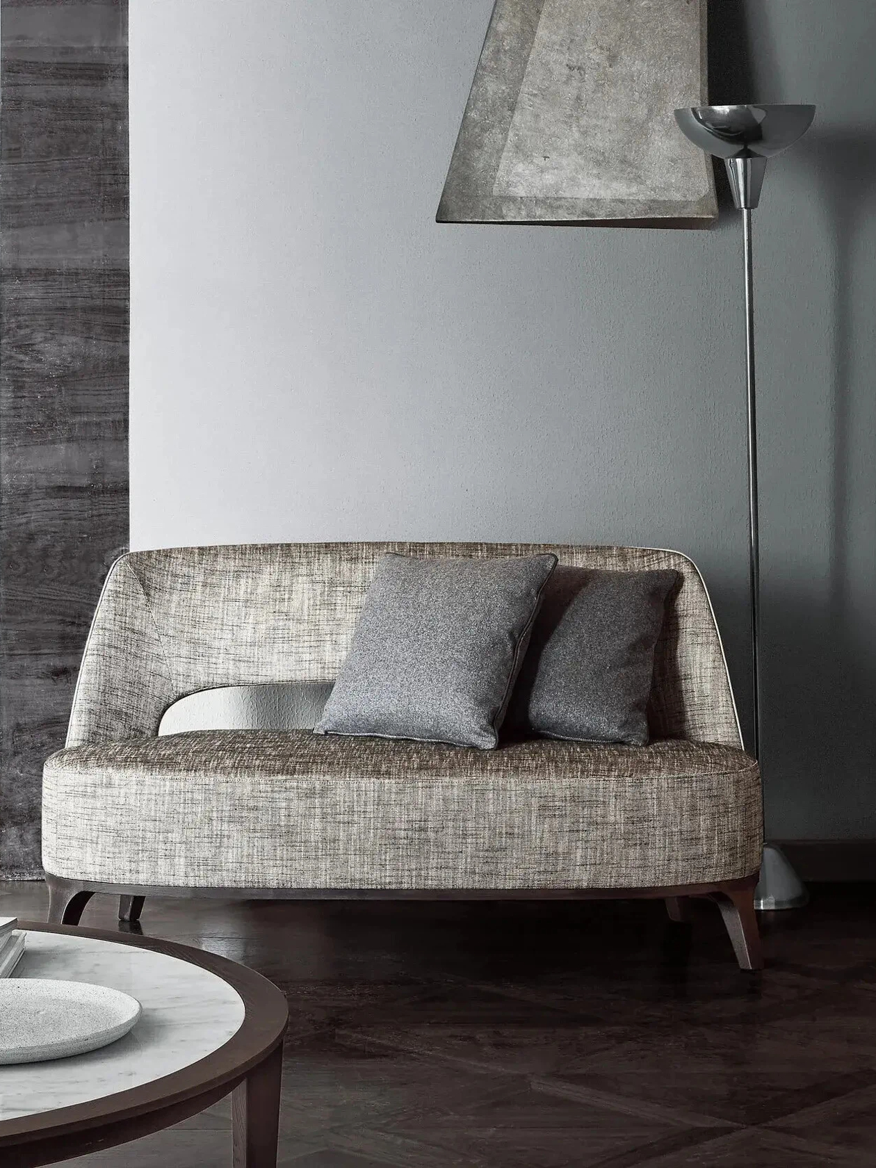 • Its mythology-inspired name serves to underscore the delicately graceful lines of the Ermione sofa. With its understated proportions, Ermione is an all-around charming sofa that can fit effortlessly in any setting. The enveloping upholstered seat back gains a lighter look thanks to an exquisitely sculpted opening above the seat. The graceful lines and vaguely retro charm of the Ermione sofa are also reflected in its base, made in cast aluminium or in solid wood in an array of sophisticated shades.