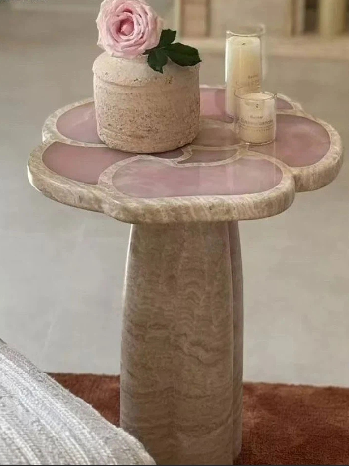 • Petal-Shaped Tabletop: The tabletop is sculpted into a delicate flower silhouette, with each “petal” inlaid with soft pink onyx. This translucent stone glows subtly in light, adding a dreamy, organic charm that mirrors blooming florals.