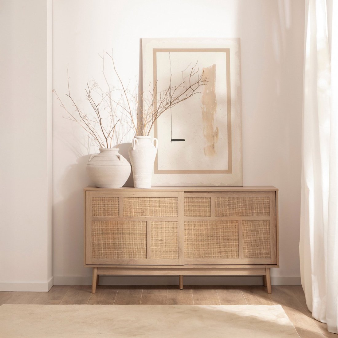 Sideboard In Natural Wood And Natural Rattan With Sliding Door