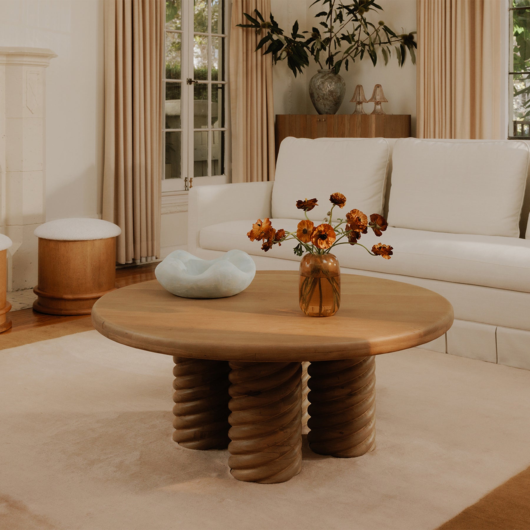 The Charlotte coffee table embodies a contemporary reinterpretation of classical aesthetics, distinguished by its intricate turned and braided details. The table features an exaggerated, elegantly detailed pedestal base, presenting a bold modern twist while ensuring practicality. Its pedestal design is visually appealing and enhances functionality, creating a welcoming, uncluttered space for gatherings and everyday use.