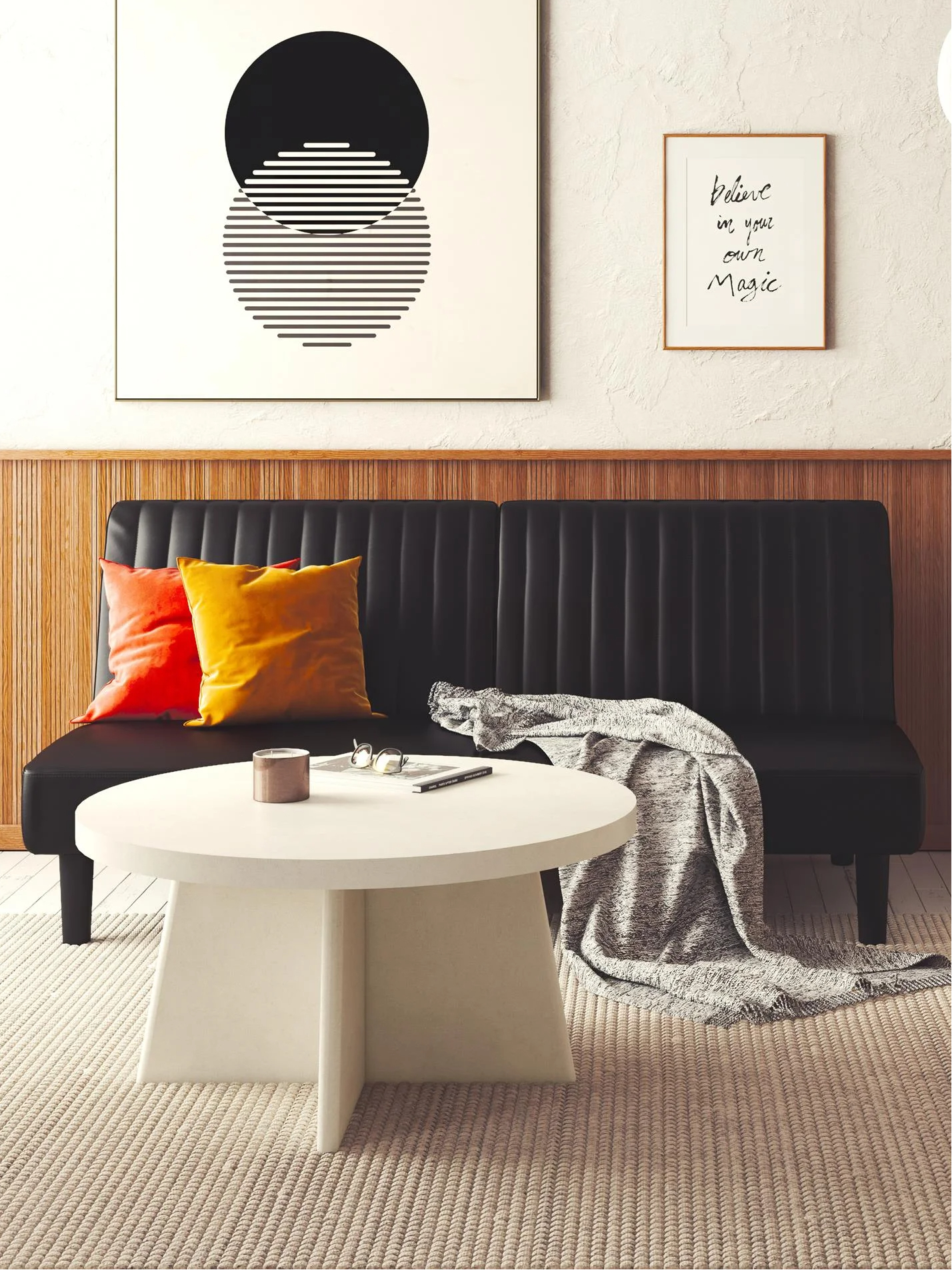 • Modern Aesthetic: Get plastered in your living room with the Liam Round Coffee Table by Ameriwood Home, featuring a creamy faux plaster finish that combines modern minimalism with rustic warmth.