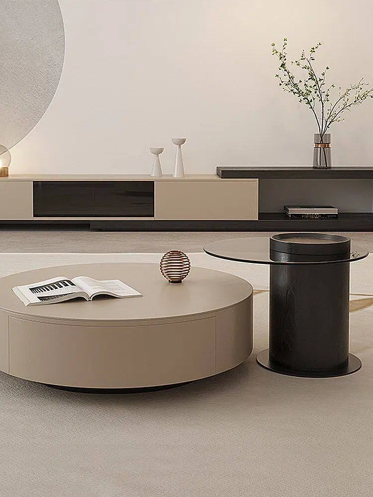 This stylish coffee table features two removable, multi-purpose components. Made of high-quality materials, the table features a wooden top and polished glass top for durability and easy cleaning. The frame is weather-resistant and load-bearing. The lower round table features drawers for storage, perfect for books, magazines, and everyday essentials. You can also use the top to display collectibles, decorative items, and plants to express your personal taste. The table's modern design complements any living room decor and adds a touch of elegance to your furniture.