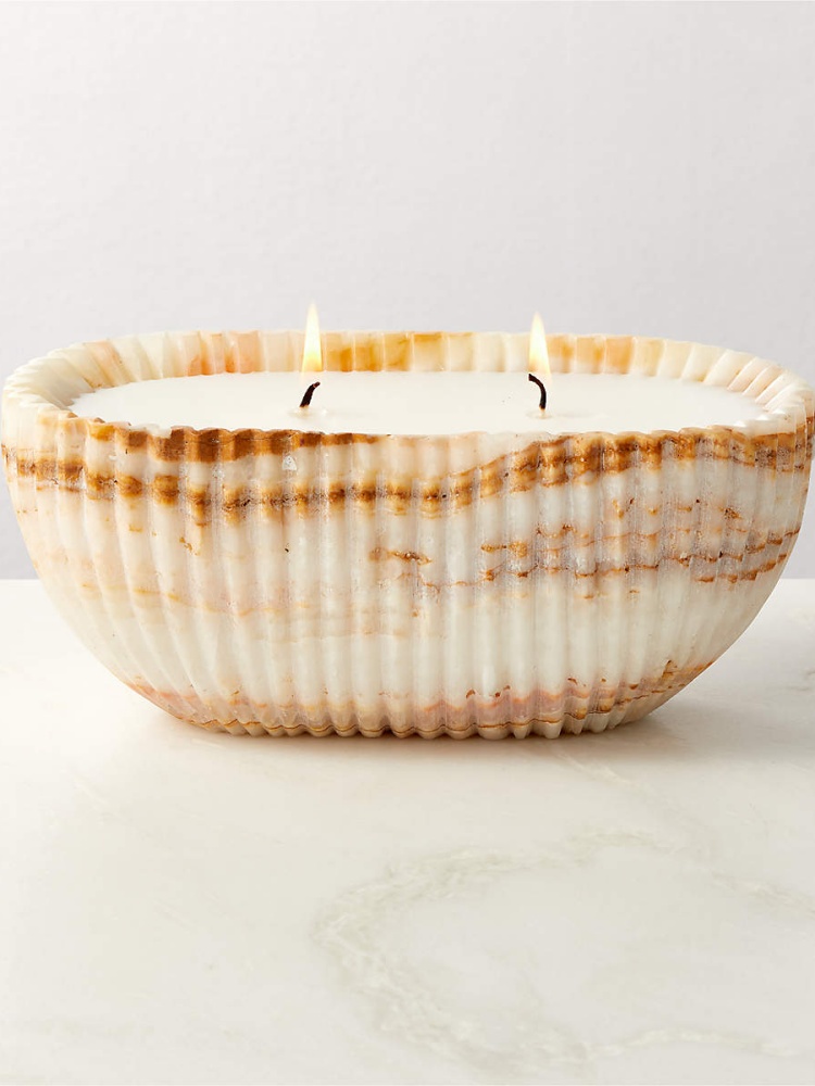 Carved from a solid piece of onyx, candle bowl is adorned with unique marbled activity and fluted detailing throughout. Inside, a hand-poured wax candle has two wicks to create twice the flickering allure. After the candle is fully burned, the vessel may be repurposed into a decorative bowl.