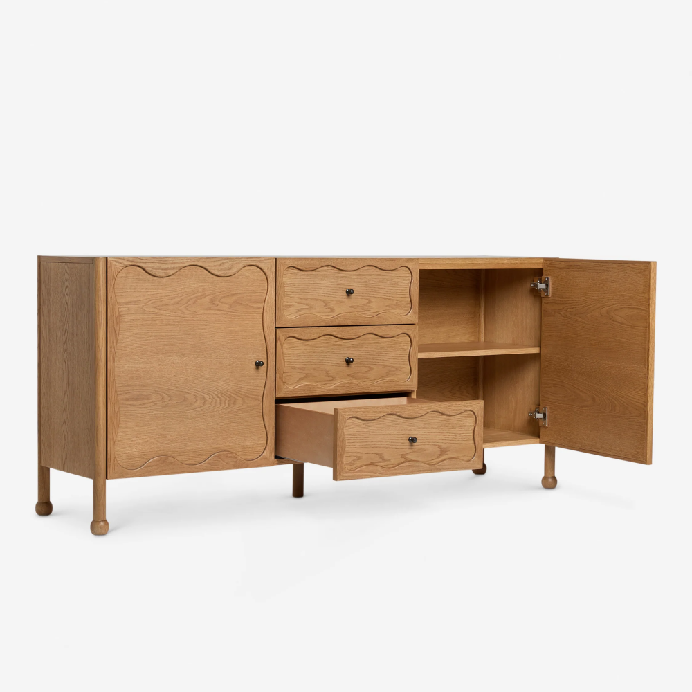 The Fontaine sideboard offers modern storage with a timeless touch. This sideboard cabinet feature three drawers flanked by two large doors with wavy detailing, black knob pulls, and ball feet to complete the look.
