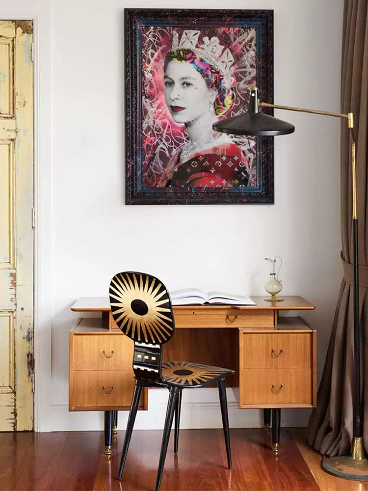 • Decorated and painted by hand and fitted with solid wooden legs, the chair is an archetype of furniture and design that could not fail to be included in Fornasetti's repertoire. This geometric decoration with gold inserts, inspired by the rays of the sun, brings a touch of luminous elegance to any room.